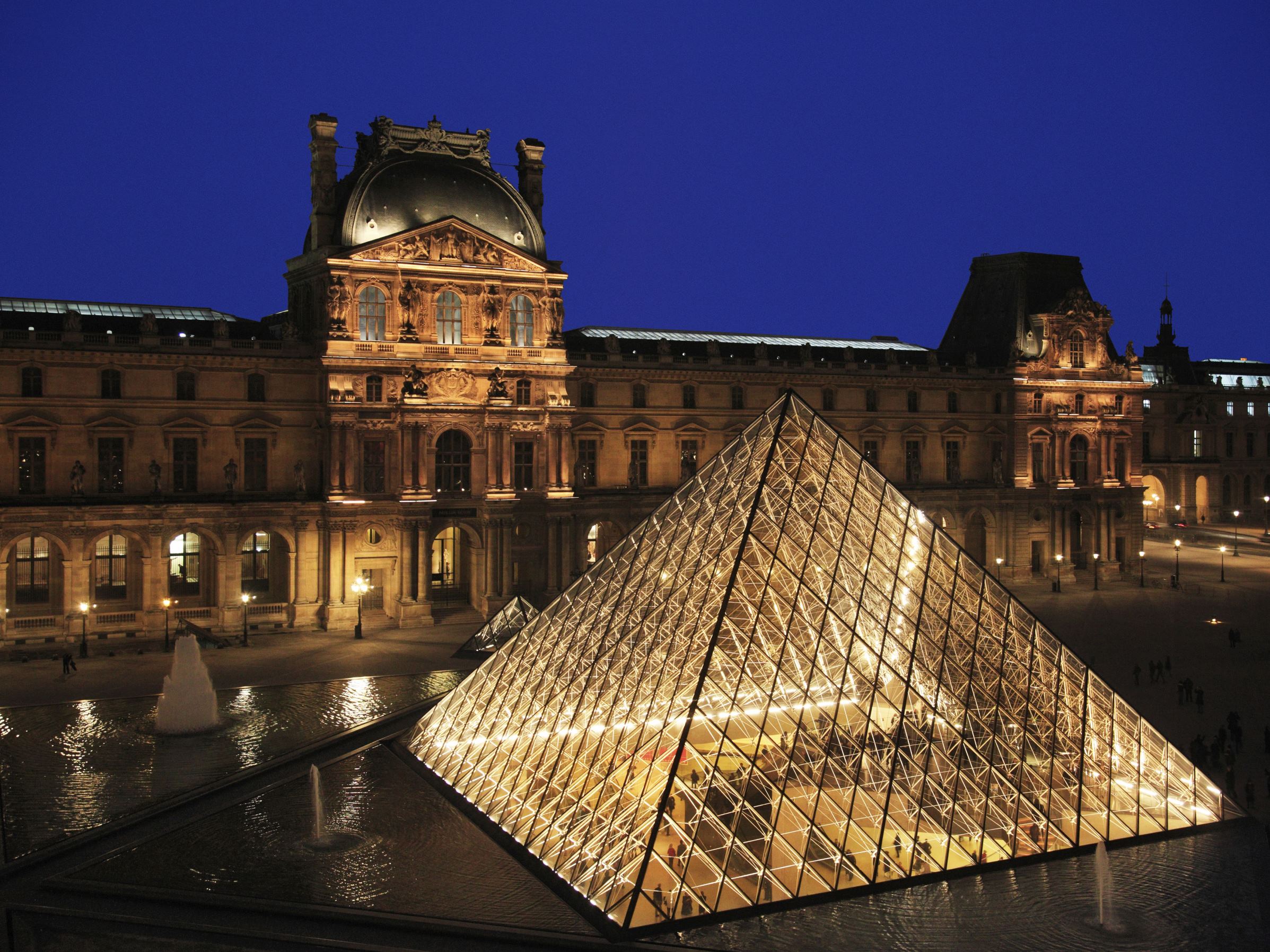 The pyramid, made with 673 glass panes, serves as the main entrance to the Louvre Museum. Designed by architect I. M. Pei, the 71-feet (21.6 meters) high glass structure is supported by steel beams and cables.