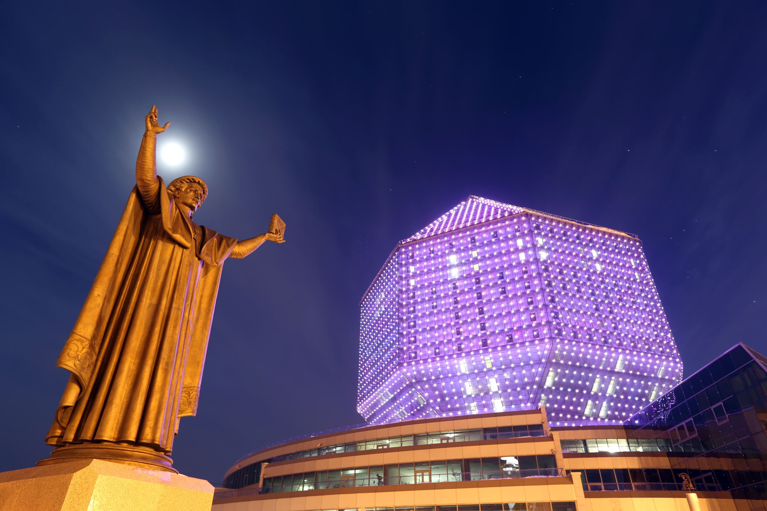 Architects Viktor Kramarenko and Mikhail Vinogradov came up with a rhombicuboctahedron design for the building — a complex polyhedron of 18 squares and 8 triangles that rests on a supporting podium. The building's surface is covered with heat-reflecting glass mirrors.